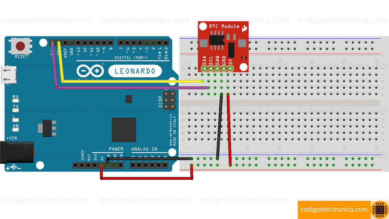 Lo único que debemos hacer es conectar nuestro módulo de reloj a nuestro arduino por medio de la comunicación I2C, la donde la librería RTClib se encarga de hacer el resto de trabajo, en la siguiente imagen podemos ver como es la conexión del circuito.