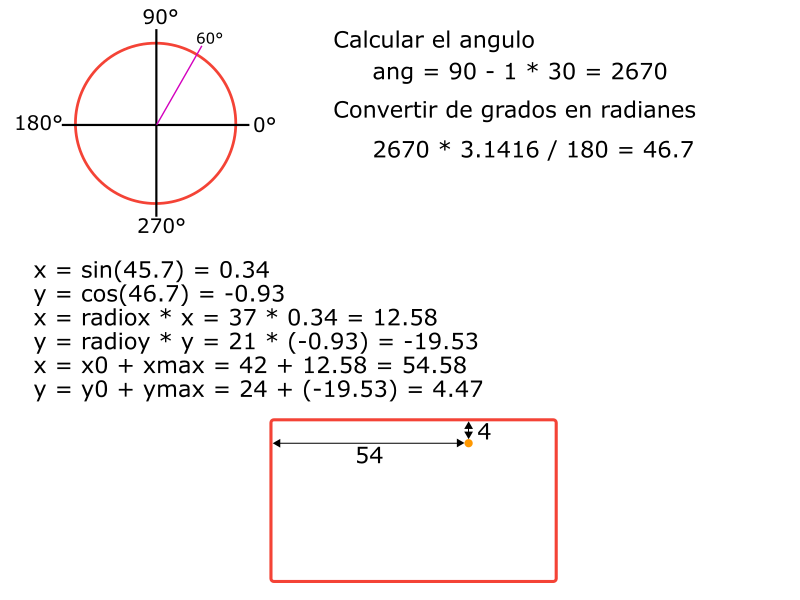Observemos la imagen anterior de cálculos de los puntos para el numero uno; primero obtenemos el ángulo, a este valor lo convertimos en radianes para las funciones trigonométricas, determinamos el seno del ángulo en radianes, luego multiplicamos el valor que obtenemos por el máximo radio en X y luego le sumamos el valor de x0 que es la media de la pantalla, en donde el resultado es la distancia en X para el número uno, para el eje de Y usamos el mismo paso como observamos en la imagen