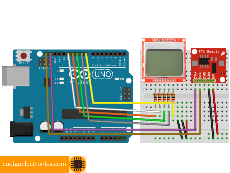 Para la construcción del circuito nos vamos a mirar con los post que tenemos sobre conexión de reloj ds1307 que explica cómo hacer la conexión de nuestro reloj y de conectar lcd nokia5110 a arduino, allí explico las conexiones y el código necesario.