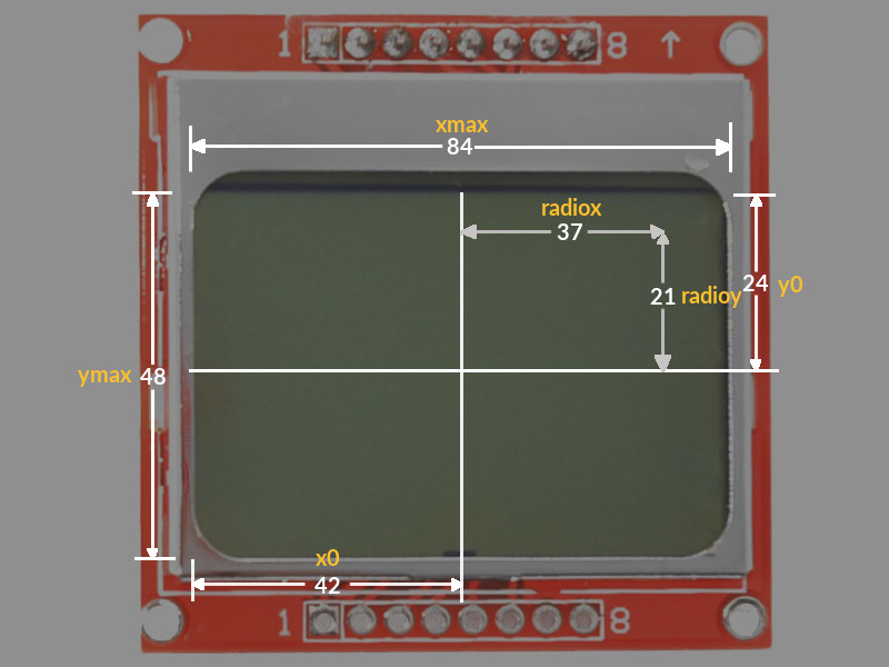 Primero vamos a determinar el tamaño en pixeles de la pantalla y fijarnos de donde están las coordenadas (0,0), para saber dónde inicia nuestro lcd; ahora según la pantalla que hemos seleccionado para nuestro proyecto donde el tamaño es de 84 por 48 px vamos obtener los puntos medios para saber dónde posicionar nuestro reloj.